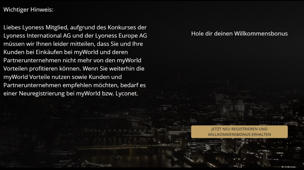 Das Mitglied könne jetzt aufgrund des Konkurses nicht mehr am myWorld-Programm teilnehmen und müsse eine Neuregistrierung bei Lyconet/myWorld durchführen. Selbstverständlich muss man bei der Neuregistrierung dem Umstieg auf mSP zugestimmt werden.